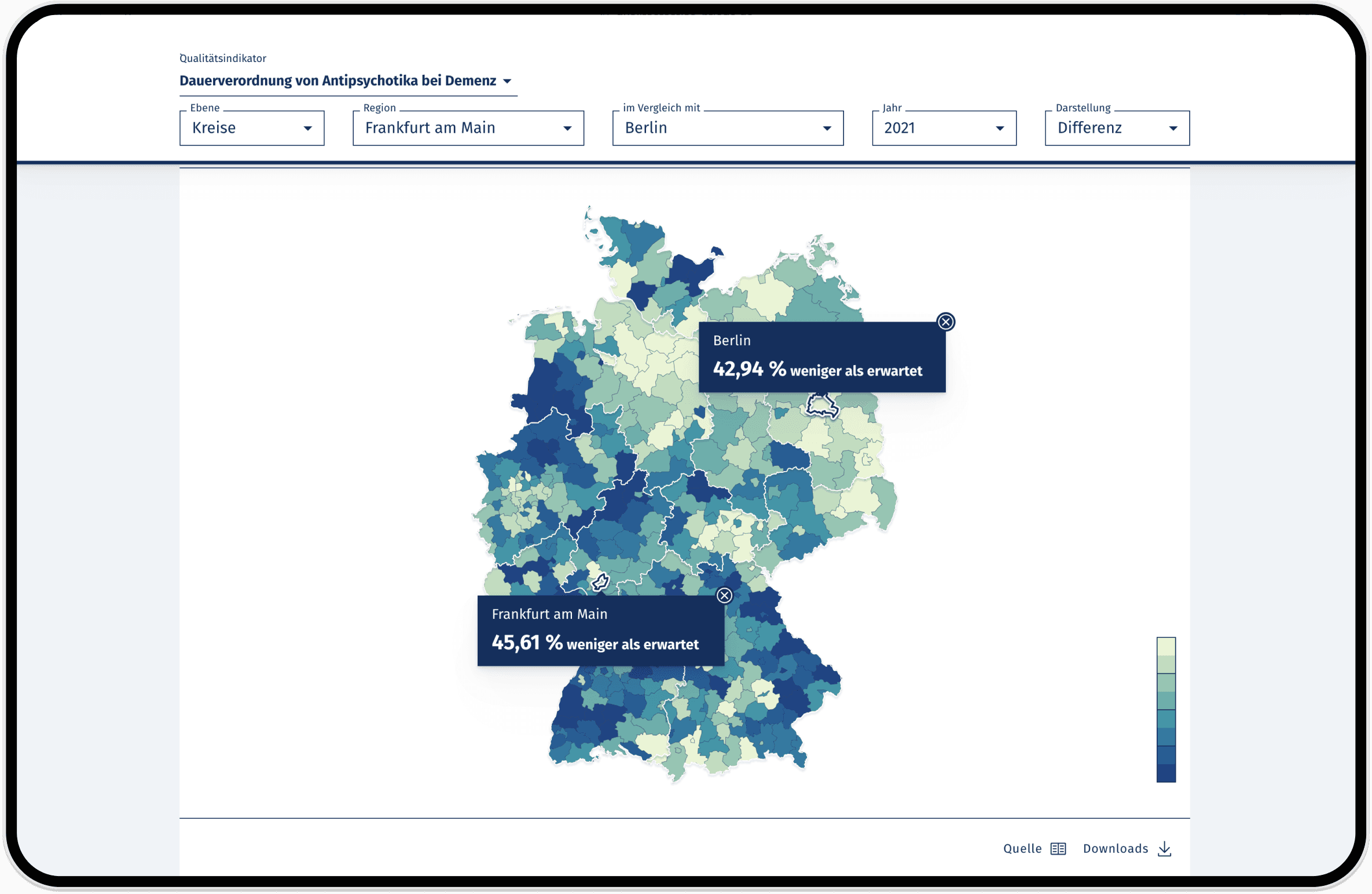 One exceptional aspect of the atlas is its ability to allow users to choose and compare two specific regions in Germany, whether at the district or federal state level. This feature empowers users to make direct comparisons between the quality of care in two different areas, track how they have evolved over time, and assess how the regions perform across the 10 different quality indicators.